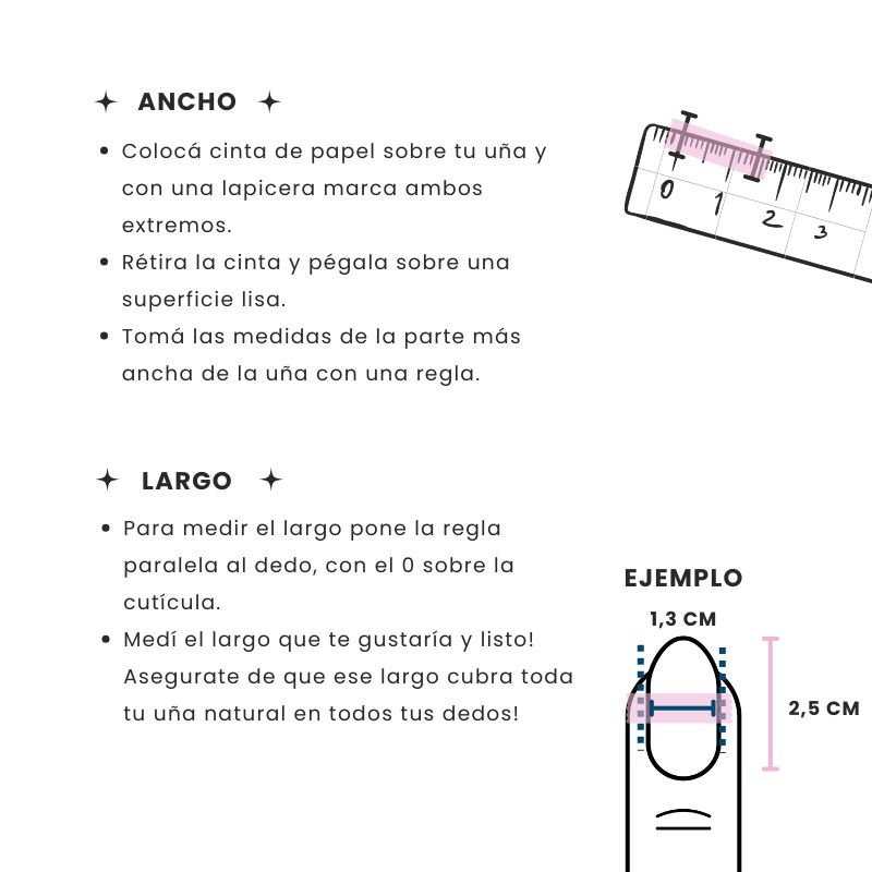 Sobre el Largo: las medidas comunes/estándar son 1,5 cm | 2 cm | 2,5 cm. Se pueden personalizar de acuerdo a las necesidades de tus uñas.